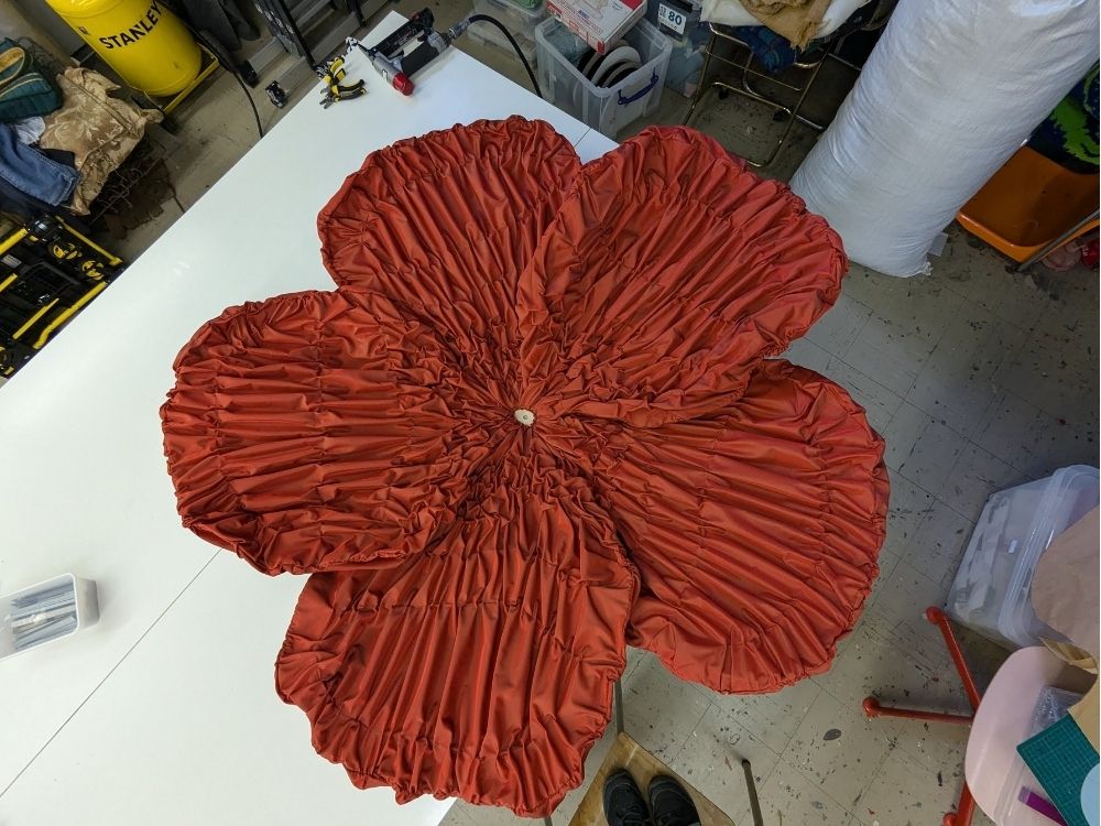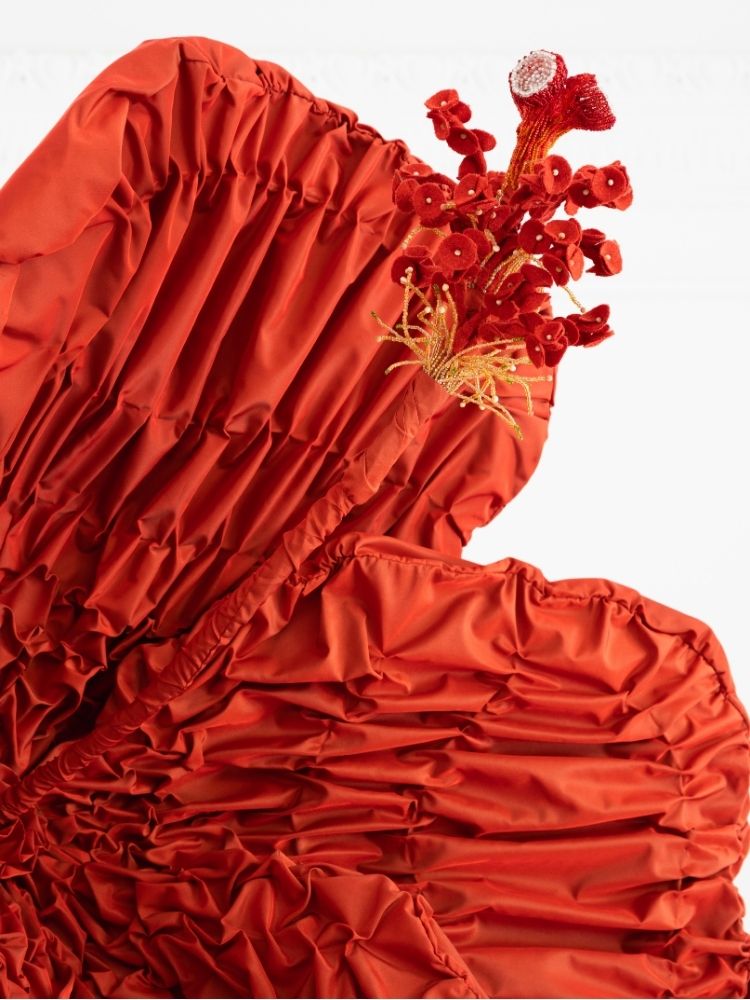 La fleur fait environ 140cm de diamètre et a nécessité 8 m de tissu, les smockes ont été réalisés à la main pour créer cet effet froissé et délicat. Le pistil est orné de coupelles en perles de verre, tissées à la main. La structure est réalisée en feutre et pvc, sélectionnés pour leur légèreté et leur malléabilité.