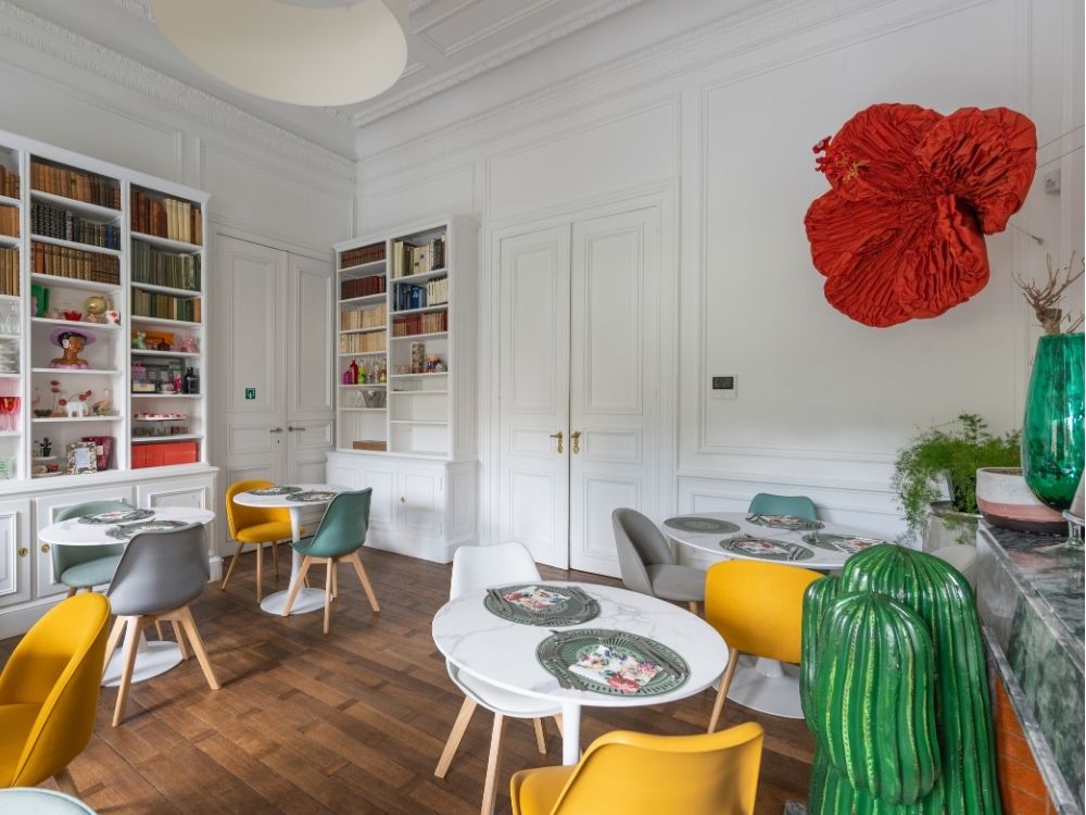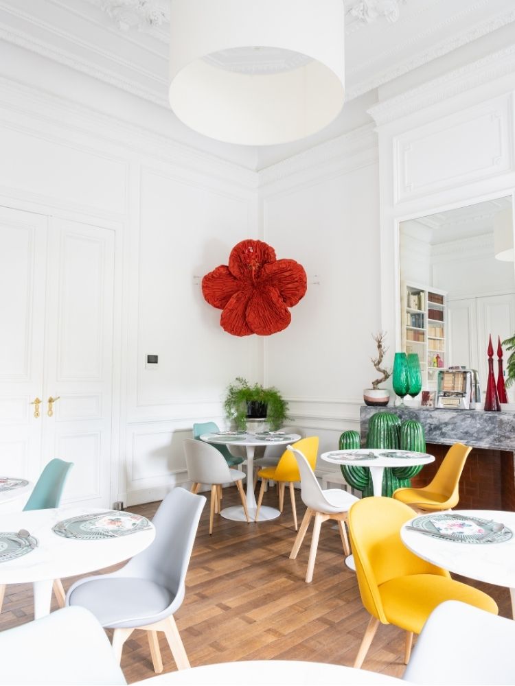 Garden café nous fait voyager dans un univers latino chic. Comme une cerise sur le gâteau de ce lieu déjà magnifique, j’ai eu le plaisir de réaliser une sculpture textile sur mesure librement inspirée de la fleur d’hibiscus.