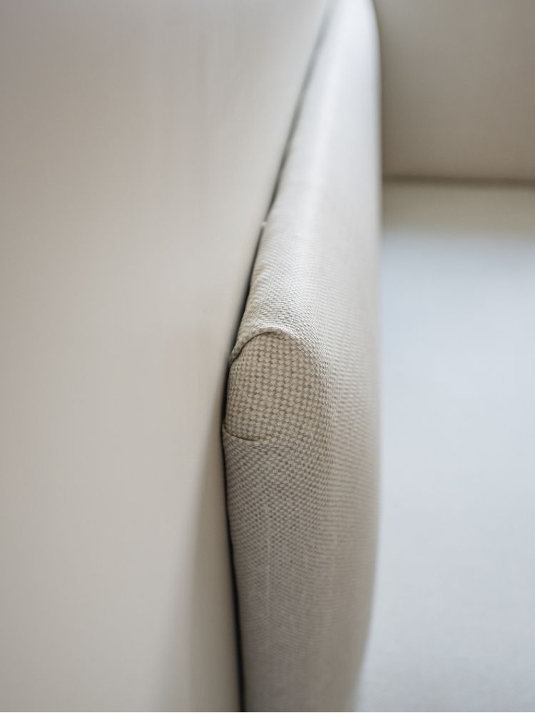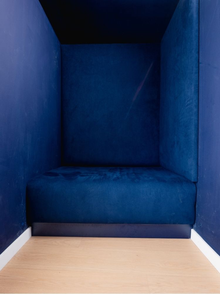 Dans ce superbe projet d’aménagement de bureau réalisé par les architectes de super.espace, chaque centimètre est étudié avec un grand souci du détail. Le sur-mesure y prend tout son sens. Atelier Alcoves a contribué à ce projet en réalisant les assises garnies des banquettes réalisées par la menuiserie Weiler, et les panneaux acoustiques de l’espace de vidéo-conférence. Un tissu microfibre fabriqué à partir de plastiques recyclés dont le ton intense et velouté correspond parfaitement à celui du stratifié, a été choisi pour la banquette d’accueil et l’alcôve. Pour l’espace cuisine, un similicuir imitant le textile est utilisé pour sa grande résistance et sa facilité d’entretien.