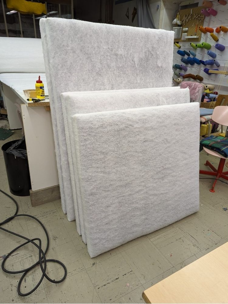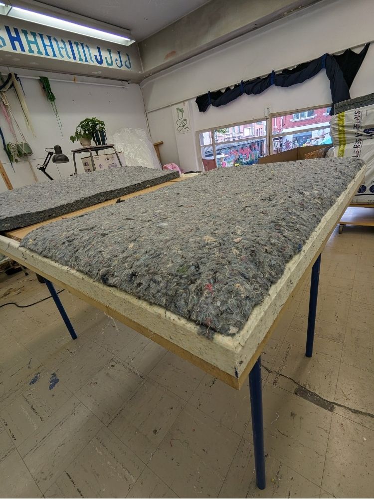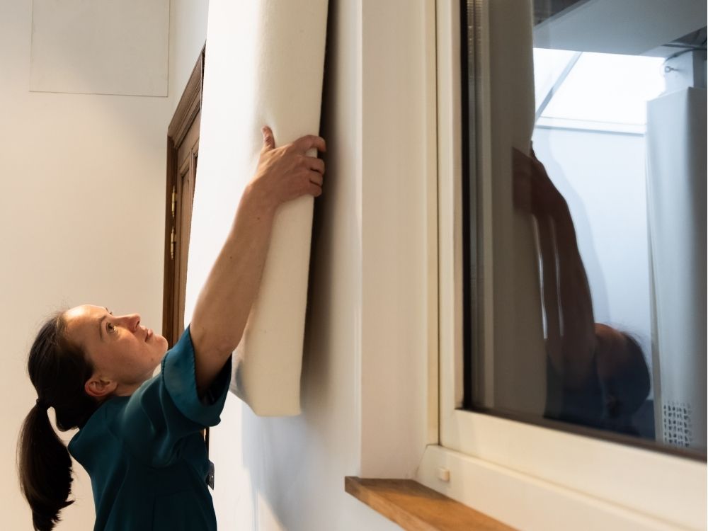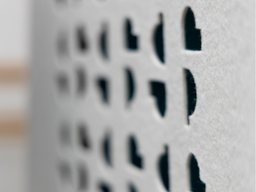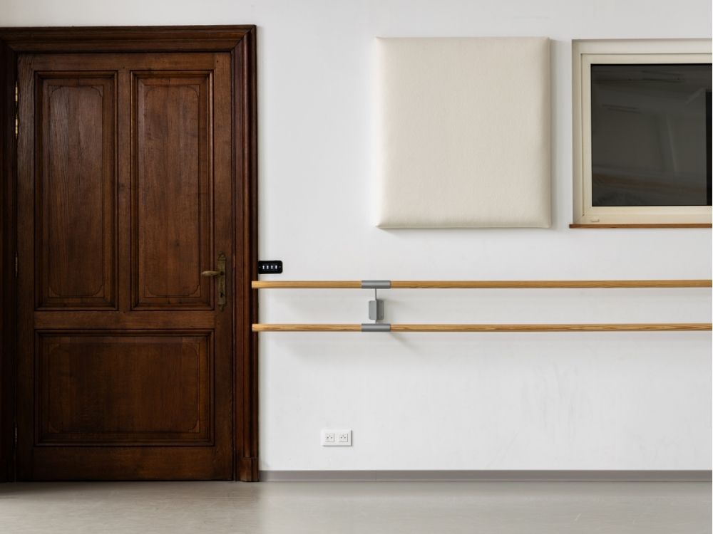 Moderne, ornée de grands miroirs, d’un sol très lisse et de radiateur de plafond, la récente salle de danse rencontrait de grandes difficultés de résonances acoustiques. Très peu d’espace était disponible pour placer des solutions, sans enfreindre la pratique de la danse. Atelier Alcoves a proposé un habillage de colonne et quelques panneaux muraux judicieusement positionnés. Le feutre suspendu autour de la colonne a été découpé par IdealFELT avec un pattern suivant l’identité graphique du Patio.