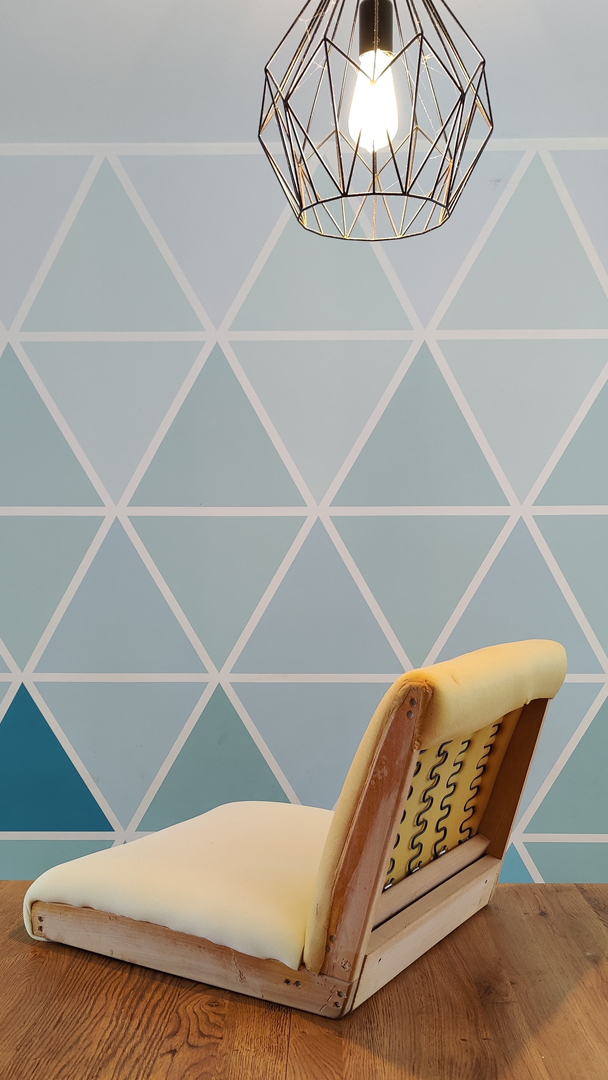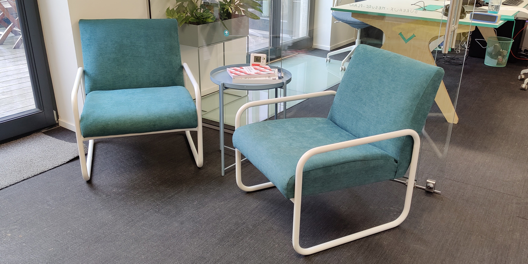 Deux fauteuils restaurés pour créer un petit coin cosy à l’entrée du bureau.