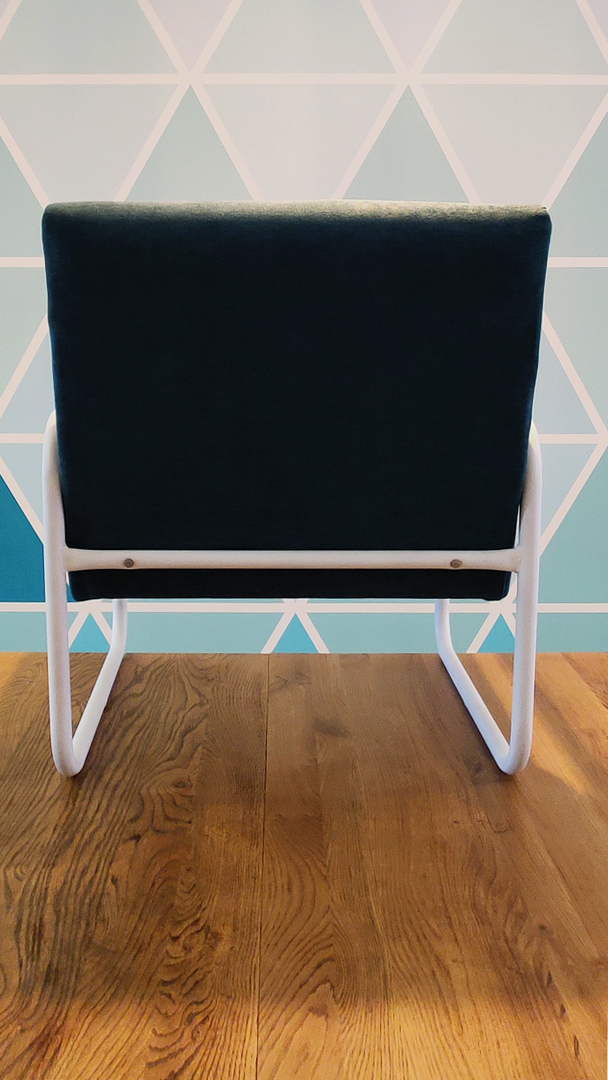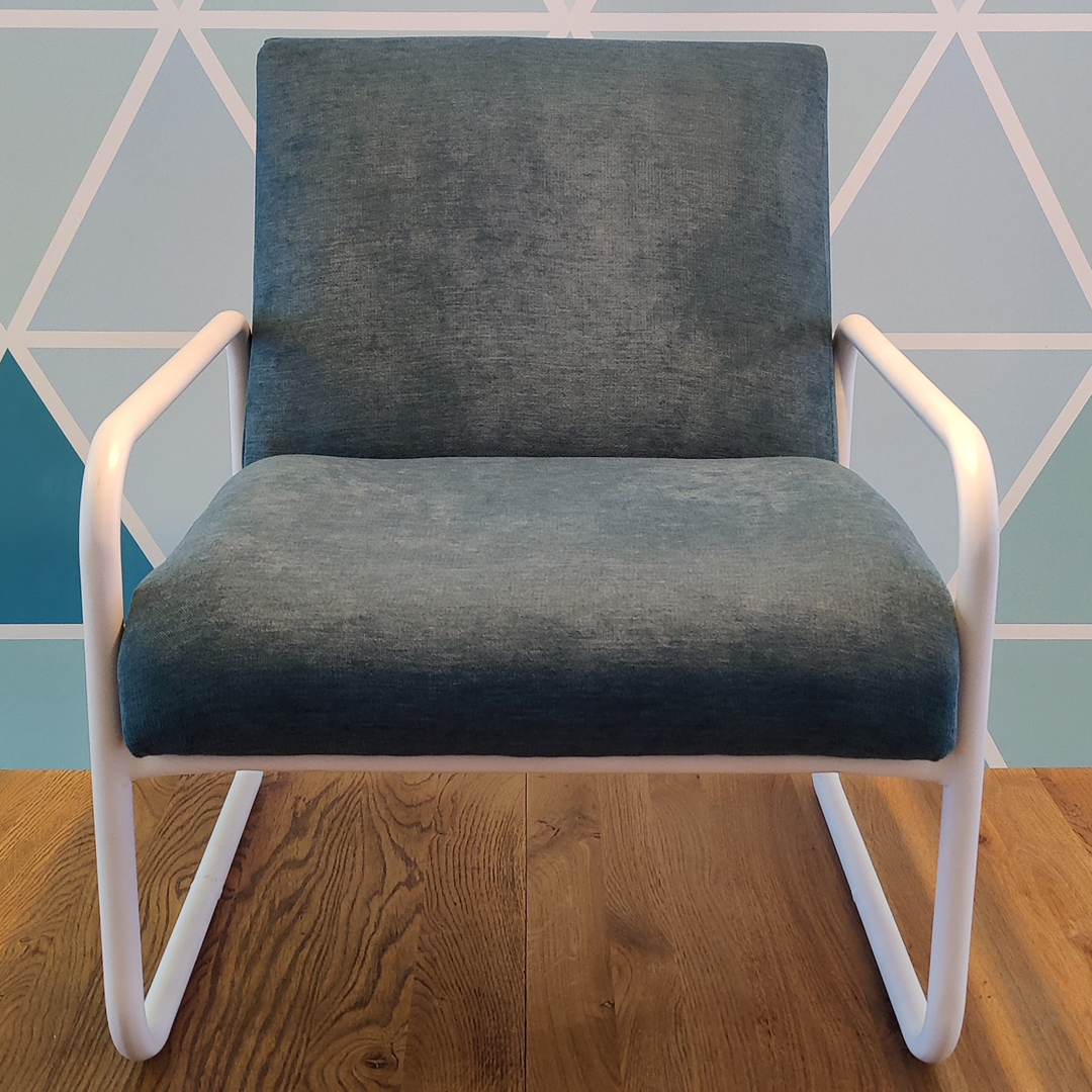 Pour aménager un coin cosy et accueillant à l’entrée de leur bureau, Whooosh m’a confié la restauration de deux fauteuils. Chez Whooosh, on est très soucieux de la personnalisation de tout ce qui touche de près ou de loin à l’environnement de travail. Ceux qui les connaissent savent qu’ils poussent le détail jusqu’au choix de leurs chaussettes! C’est donc tout naturellement que les deux fauteuils sont passés de leur jaune vif d’origine à ceux des couleurs “whooosh”. Les structures sont repeintes en blanc matt. Le rembourrage a nécessité de légères réparations. Le revêtement choisi est un velours légèrement texturé dans les tons turquoises. Les deux fauteuils accueillent les réunions informelles ou tout qui s'arrête quelques minutes prendre un café.