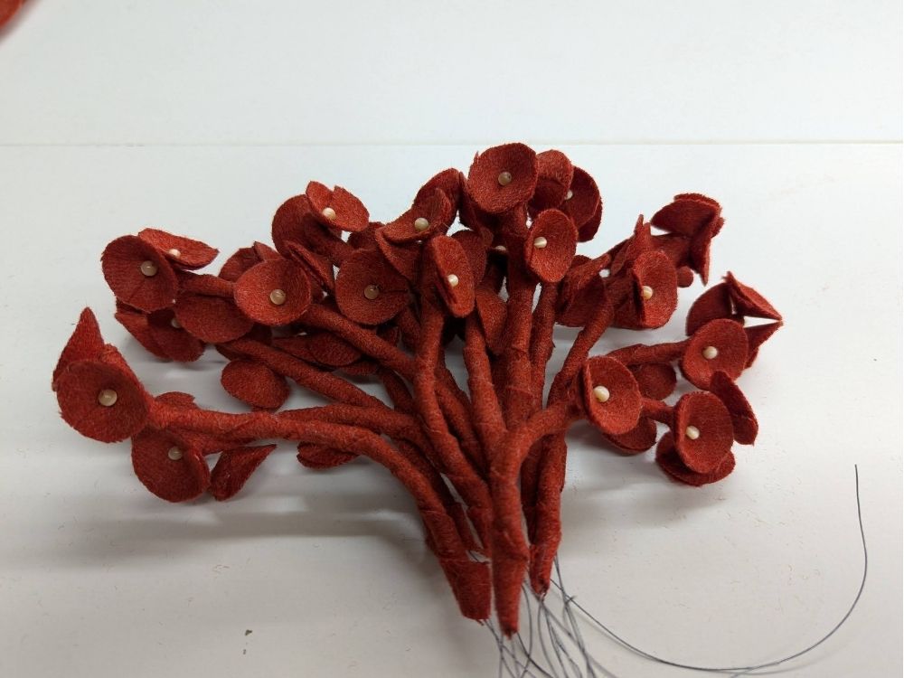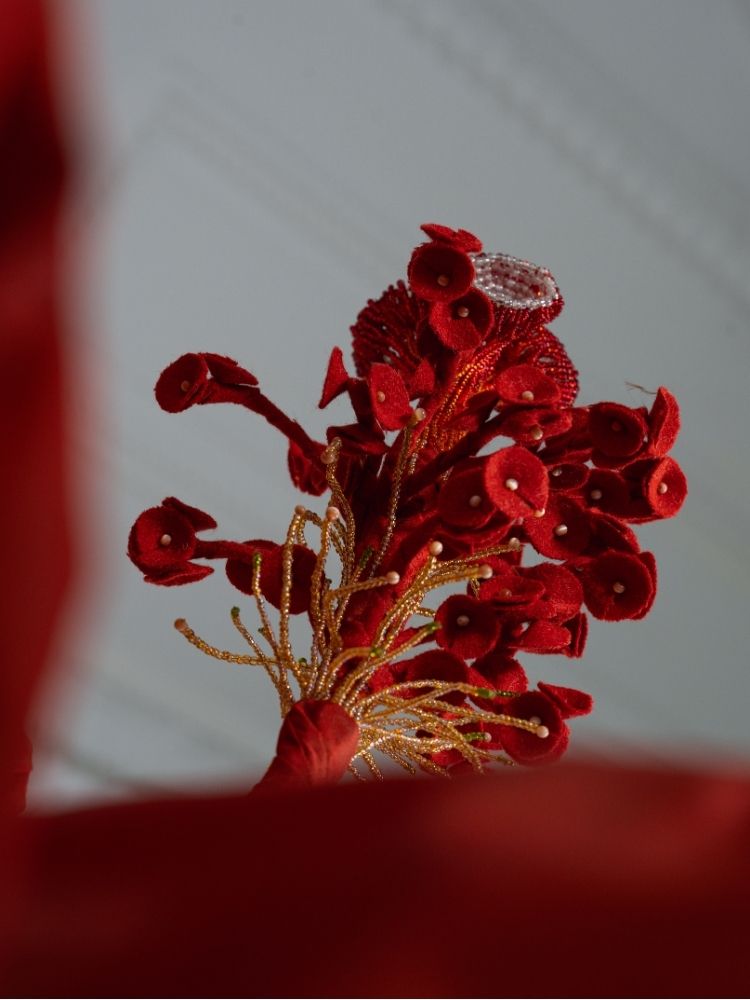 La fleur fait environ 140cm de diamètre et a nécessité 8 m de tissu, les smockes ont été réalisés à la main pour créer cet effet froissé et délicat. Le pistil est orné de coupelles en perles de verre, tissées à la main. La structure est réalisée en feutre et pvc, sélectionnés pour leur légèreté et leur malléabilité.