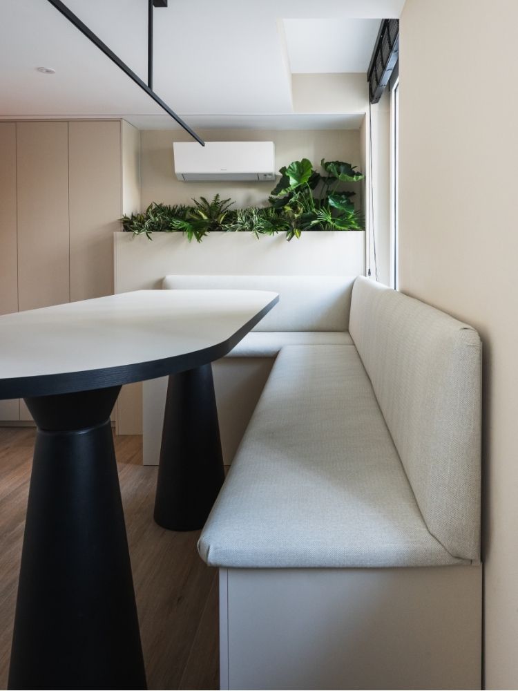 Dans ce superbe projet d’aménagement de bureau réalisé par les architectes de super.espace, chaque centimètre est étudié avec un grand souci du détail. Le sur-mesure y prend tout son sens. Atelier Alcoves a contribué à ce projet en réalisant les assises garnies des banquettes réalisées par la menuiserie Weiler, et les panneaux acoustiques de l’espace de vidéo-conférence. Un tissu microfibre fabriqué à partir de plastiques recyclés dont le ton intense et velouté correspond parfaitement à celui du stratifié, a été choisi pour la banquette d’accueil et l’alcôve. Pour l’espace cuisine, un similicuir imitant le textile est utilisé pour sa grande résistance et sa facilité d’entretien.