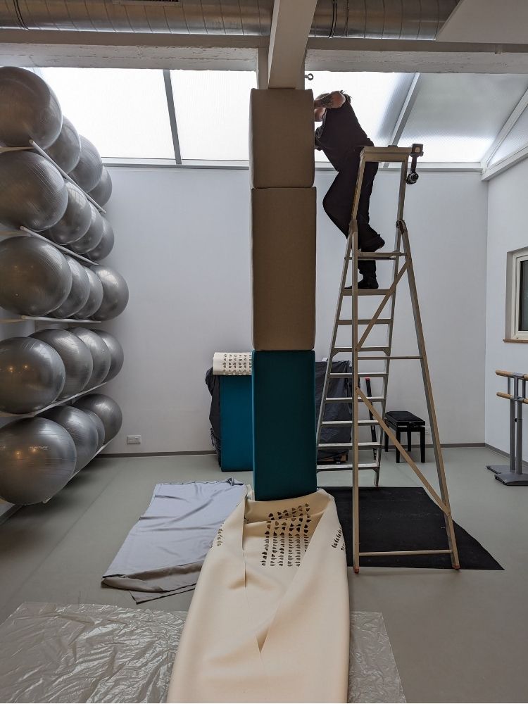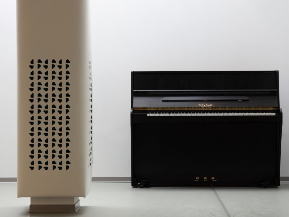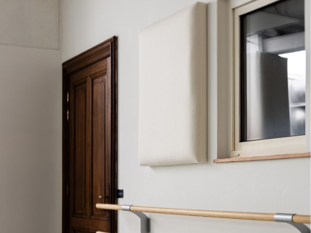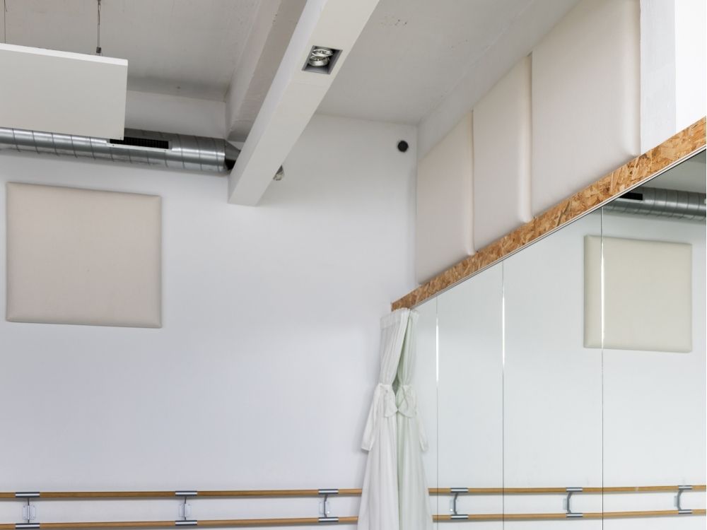 Moderne, ornée de grands miroirs, d’un sol très lisse et de radiateur de plafond, la récente salle de danse rencontrait de grandes difficultés de résonances acoustiques. Très peu d’espace était disponible pour placer des solutions, sans enfreindre la pratique de la danse. Atelier Alcoves a proposé un habillage de colonne et quelques panneaux muraux judicieusement positionnés. Le feutre suspendu autour de la colonne a été découpé par IdealFELT avec un pattern suivant l’identité graphique du Patio.