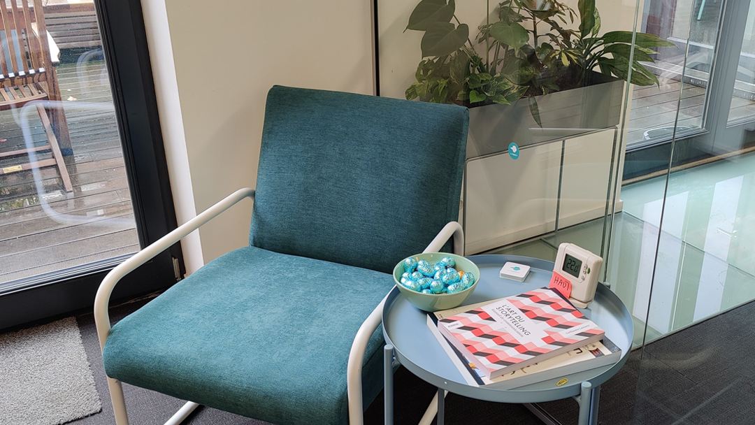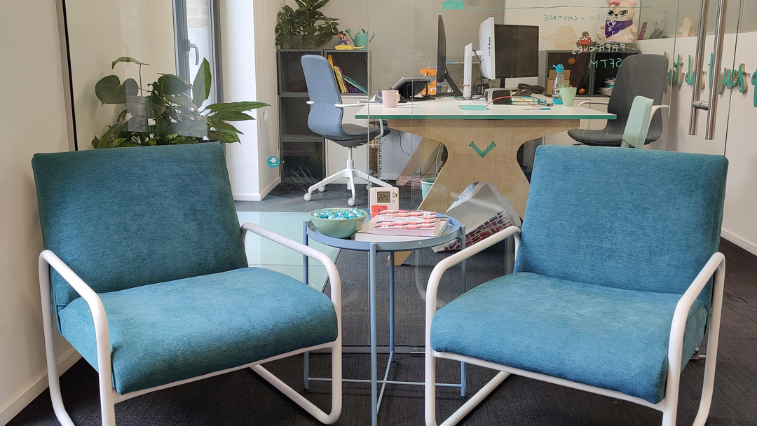 Deux fauteuils restaurés pour créer un petit coin cosy à l’entrée du bureau.