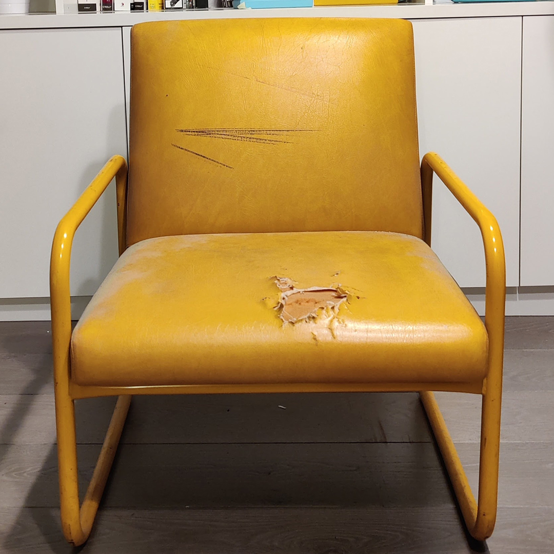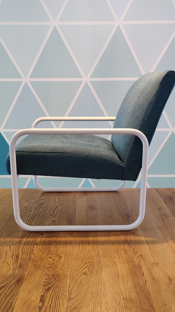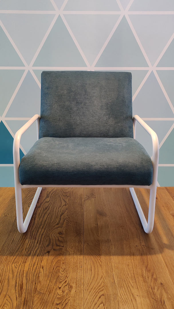 Pour aménager un coin cosy et accueillant à l’entrée de leur bureau, Whooosh m’a confié la restauration de deux fauteuils. Chez Whooosh, on est très soucieux de la personnalisation de tout ce qui touche de près ou de loin à l’environnement de travail. Ceux qui les connaissent savent qu’ils poussent le détail jusqu’au choix de leurs chaussettes! C’est donc tout naturellement que les deux fauteuils sont passés de leur jaune vif d’origine à ceux des couleurs “whooosh”. Les structures sont repeintes en blanc matt. Le rembourrage a nécessité de légères réparations. Le revêtement choisi est un velours légèrement texturé dans les tons turquoises. Les deux fauteuils accueillent les réunions informelles ou tout qui s'arrête quelques minutes prendre un café.