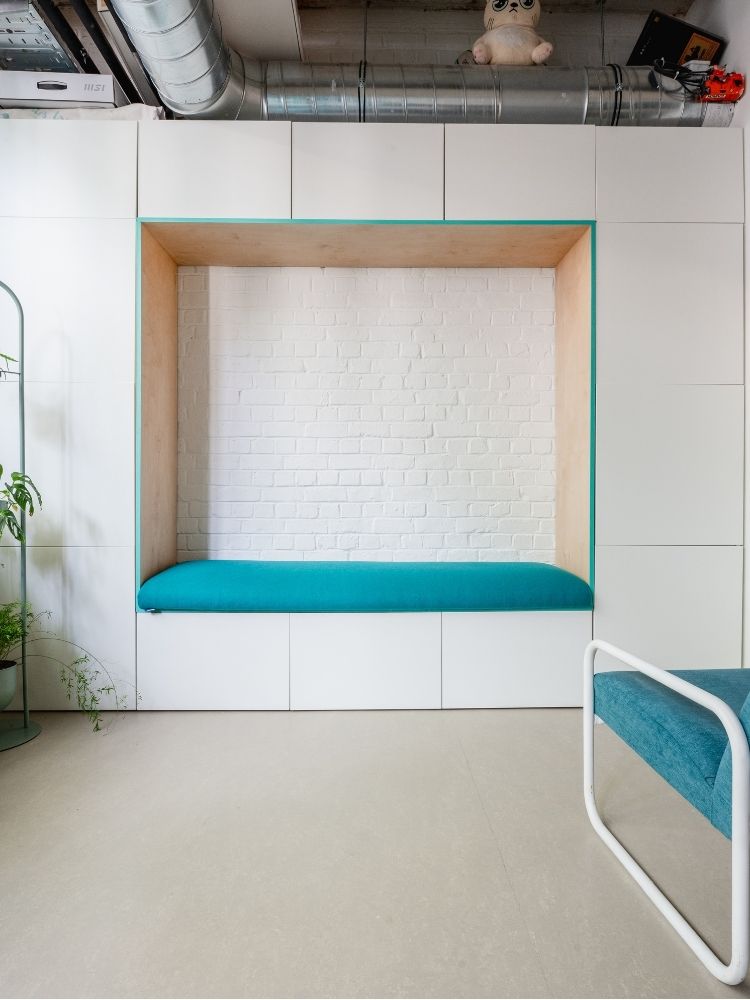 L’agence de motion design, Whooosh, a toujours été très attentive à son branding fort et très présent. Leur nouveau bureau situé à la Menuiserie, un espace de bureau partagé dédié aux acteurs de la transition au centre de Liège, est dans cette lignée. Atelier Alcoves y a placé une banquette au couleur de l’agence et un grand mural acoustique. En accord avec les valeurs du lieu, une grande attention a été donnée au choix des matériaux. La banquette a été réalisée à partir d’un vieux matelas. Les tissus utilisés sont issus de chutes ou de stock dormant. Les panneaux acoustiques ont été réalisés sans utilisation de colle. Un chouette projet pour un espace de travail dans lequel on se sent bien.